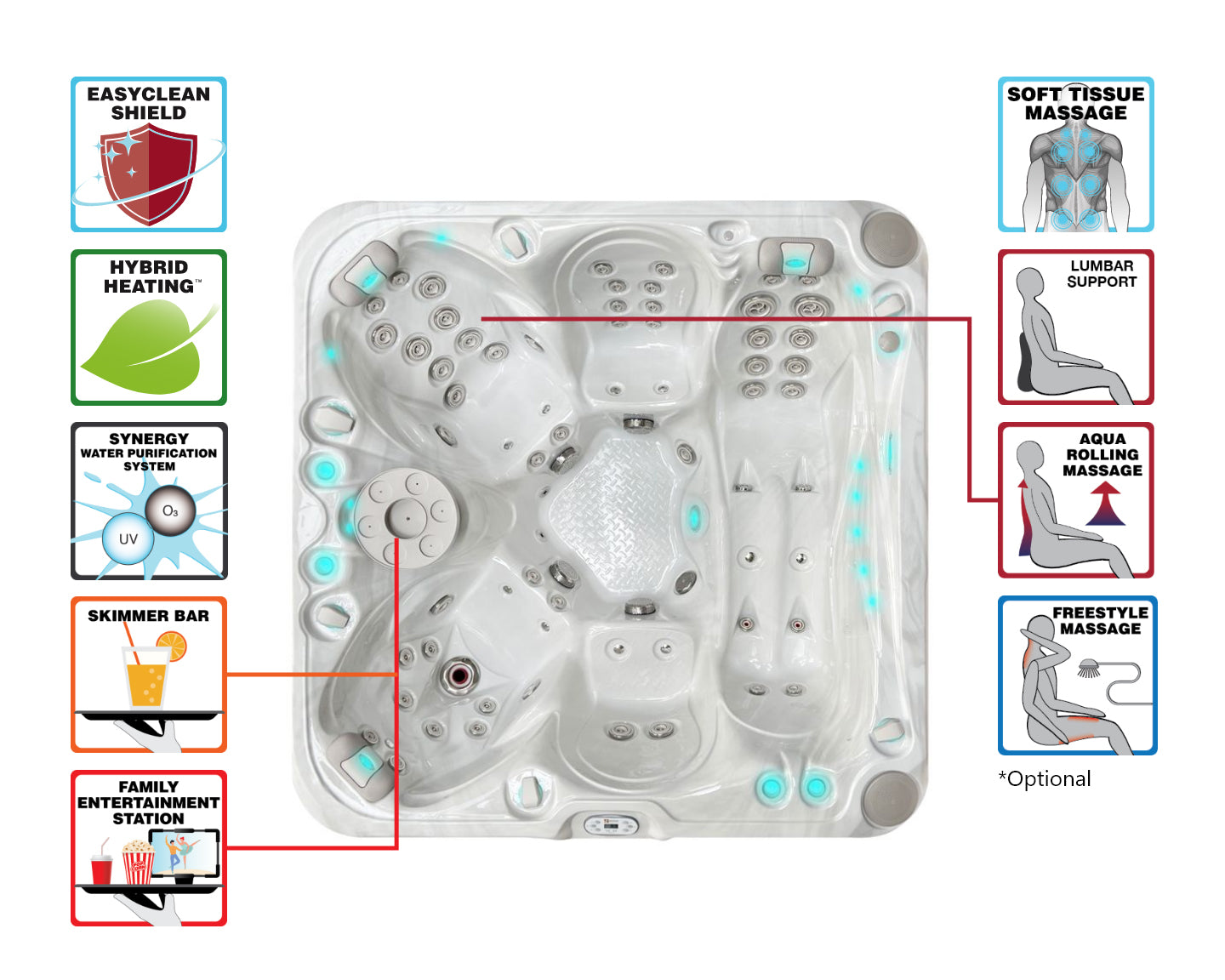 Chaque collection de signature Passion Spa A une variété de fonctionnalités de massage qui créeront le ultime en soulagement de l'hydrothérapie pour vous. Grâce à des années d'expérience et de coopération étroite avec les physiothérapeutes, nous avons conçu une variété d'expériences de massage qui sont uniques à la collection de signature Passion Spas tel que Massage des tissus mous ™, tous les jets hydrothérapeutiques sont positionnés d'une manière que seuls les tissus mous des muscles et les tendons sont massés comme le feraient un masseur professionnel. L'unique Support lombaire™ Dans chaque siège améliore le confort et combiné avec des jets soigneusement sélectionnés, offrant une variété de techniques de massage, y compris des jets pulsants, vibrants, rotationnels et directionnels, pour une expérience de massage rafraîchissante et diversifiée. Tous les spas de collecte de signature sont soutenus avec l'unique Passion Spas Aqua Rolling Massage ™ fonctionnalité. Cela reproduit une technique utilisée par les massothérapeutes professionnels, où l'eau, tout comme les mains d'un masseur, offre un mouvement puissant du bas du dos jusqu'aux épaules et au cou en un mouvement fluide, fournissant la sensation ultime de relaxation et de soulagement. Tous les spas de collecte de signature sont livrés avec un Massage libre Option afin de masser le point critique qui nécessite un traitement supplémentaire.