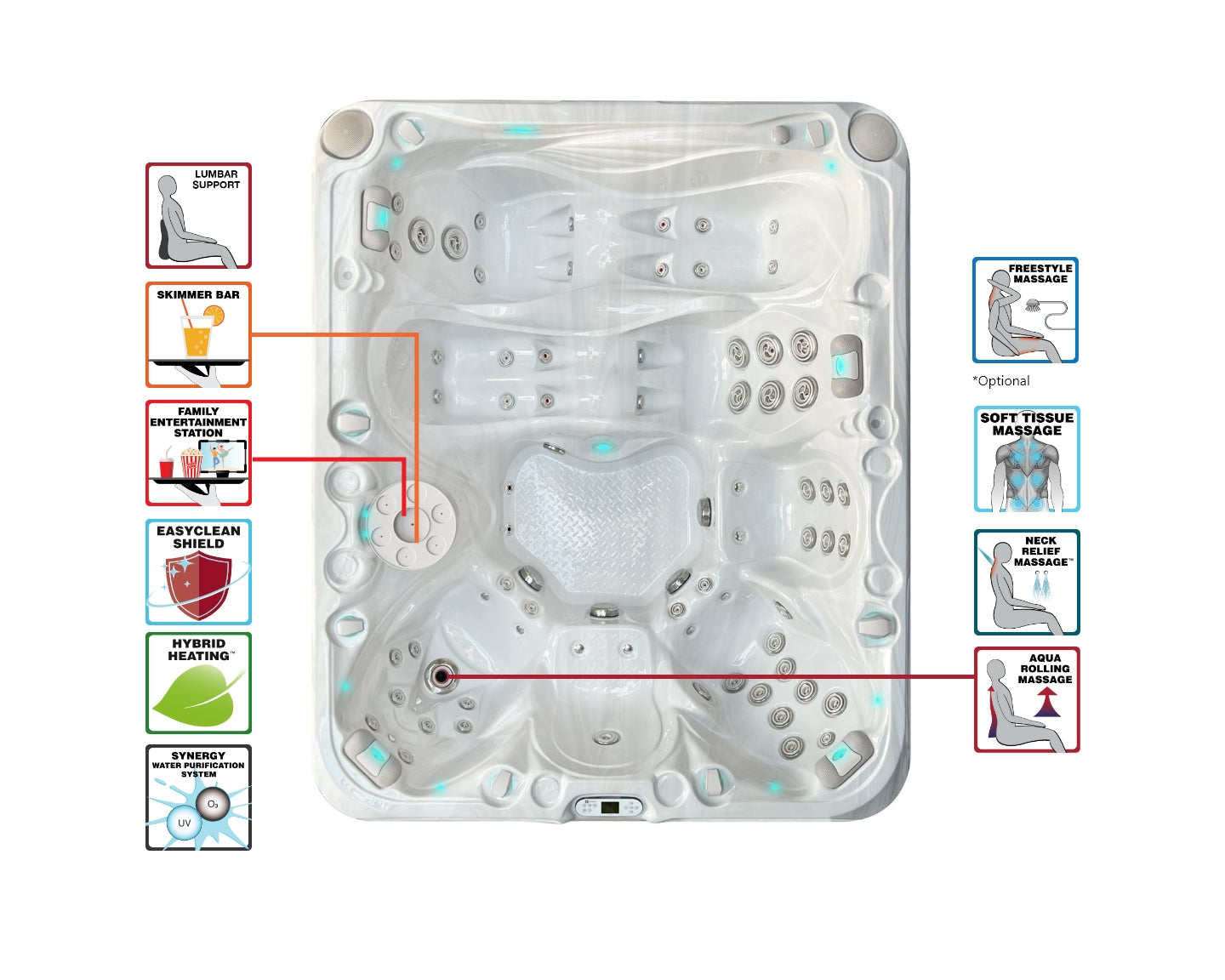 Chaque collection de signature Passion Spa A une variété de fonctionnalités de massage qui créeront le ultime en soulagement de l'hydrothérapie pour vous. Grâce à des années d'expérience et de coopération étroite avec les physiothérapeutes, nous avons conçu une variété d'expériences de massage qui sont uniques à la collection de signature Passion Spas tel que Massage des tissus mous ™, tous les jets hydrothérapeutiques sont positionnés d'une manière que seuls les tissus mous des muscles et les tendons sont massés comme le feraient un masseur professionnel. L'unique Support lombaire Dans chaque siège améliore le confort et combiné avec des jets soigneusement sélectionnés, offrant une variété de techniques de massage, y compris des jets pulsants, vibrants, rotationnels et directionnels, pour une expérience de massage rafraîchissante et diversifiée. Tous les spas de collecte de signature sont soutenus avec l'unique Passion Spas Aqua Rolling Massage ™ fonctionnalité. Cela reproduit une technique utilisée par les massothérapeutes professionnels, où l'eau, tout comme les mains d'un masseur, offre un mouvement puissant du bas du dos jusqu'aux épaules et au cou en un mouvement fluide, fournissant la sensation ultime de relaxation et de soulagement. Tous les spas de collecte de signature sont livrés avec un Massage libre Option afin de masser le point critique qui nécessite un traitement supplémentaire.