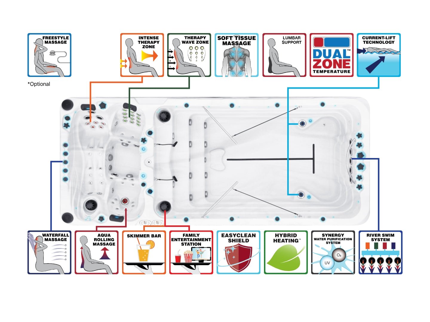 Passion Spas Pioneers Current-lift Technology ™, permettant aux nageurs de rester à flot à différents niveaux actuels. Il s'adapte automatiquement à votre entraînement, optimisant le débit d'eau.
