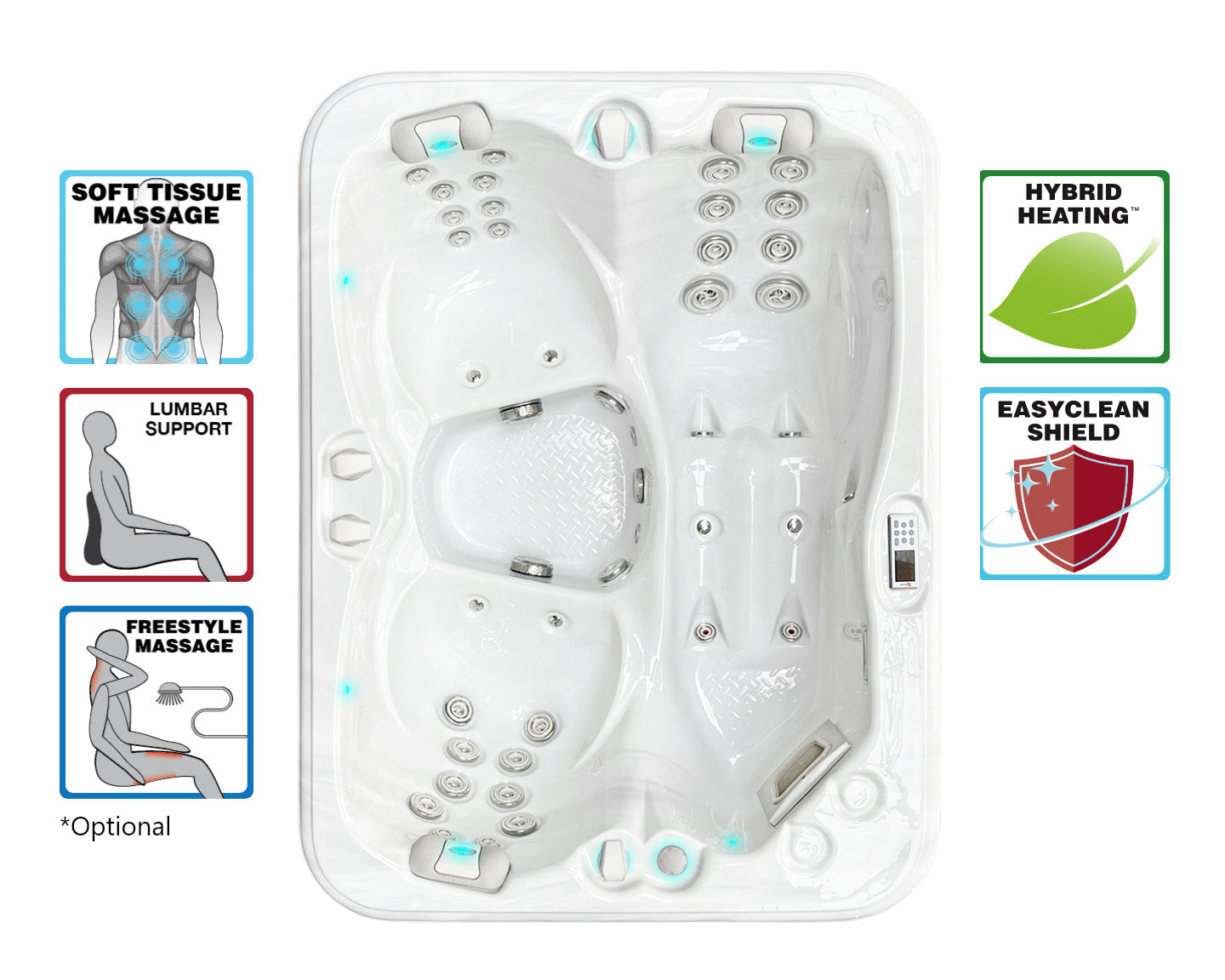 Chaque collection pure Passion Spa A une variété de fonctionnalités de massage qui créeront le ultime en soulagement de l'hydrothérapie pour vous. Grâce à des années d'expérience et de coopération étroite avec les physiothérapeutes, nous avons conçu une variété d'expériences de massage qui sont uniques à la collection pure Passion Spas tel que Massage des tissus mous ™, tous les jets hydrothérapeutiques sont positionnés d'une manière que seuls les tissus mous des muscles et les tendons sont massés comme le feraient un masseur professionnel. L'unique Support lombaire™ Dans chaque siège améliore le confort et combiné avec des jets soigneusement sélectionnés, offrant une variété de techniques de massage, y compris des jets pulsants, vibrants, rotationnels et directionnels, pour une expérience de massage rafraîchissante et diversifiée. Tous les spas de collection pure sont livrés avec un Massage libre Option afin de masser le point critique qui nécessite un traitement supplémentaire.